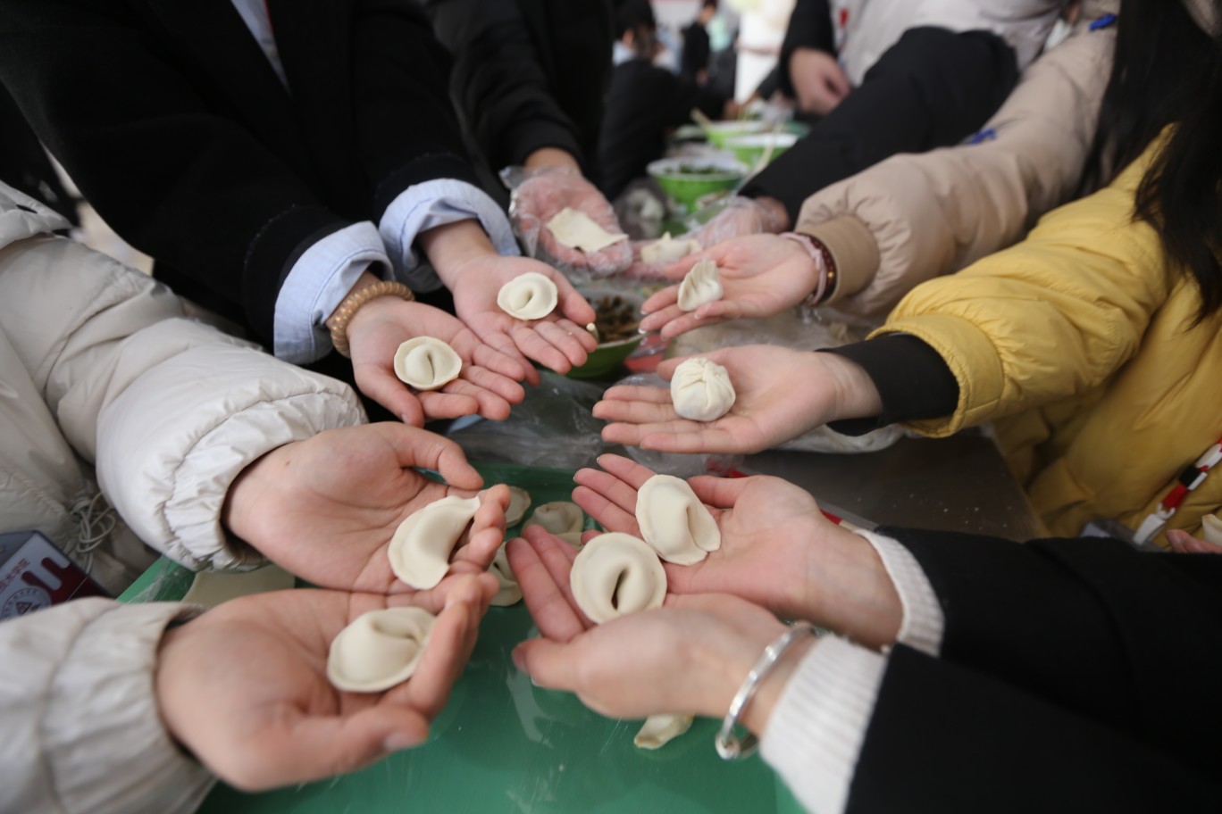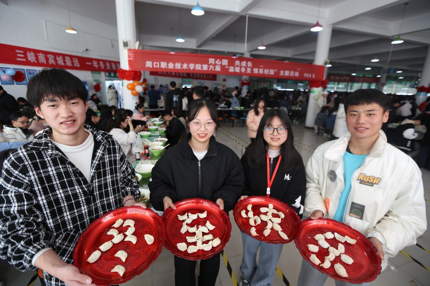 现场,还有几名学生把饺子组成“冬至快乐”几个大字,抒发大家内心的幸福情感。