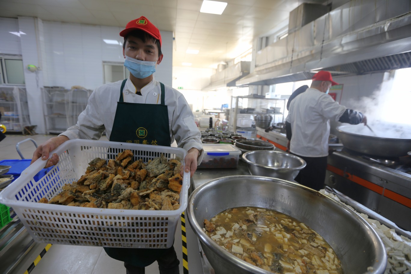 冬至这天一早,学校食堂的师傅们就开始忙碌起来。去鳞、清洗、开炸……几个小时后,近千斤新鲜的草鱼变成了鲜香的鱼块。上午11时许,师生联欢包饺子的活动开始前,一锅锅酸辣可口的鱼汤首先“登场”,成为全校师生冬至的“开胃美餐”。
