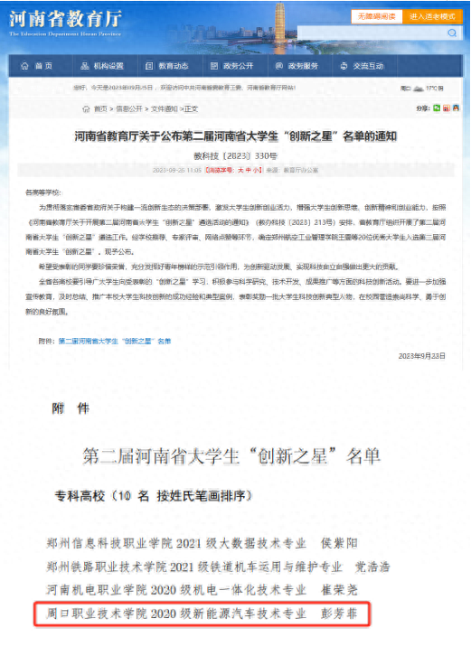 9月22日,河南省教育厅公布了第二届河南省大学生“创新之星”名单,此次共评选出年度大学生“创新之星”20名。经过二级学院(部)推荐、学校推荐、专家评审、网络点赞、公示等环节,金年会jinnianhuicom汽车与机电工程学院新能源汽车技术专业2023届毕业生彭芳菲荣获第二届河南省大学生“创新之星”荣誉称号,这是金年会jinnianhuicom学子连续两届获此殊荣。