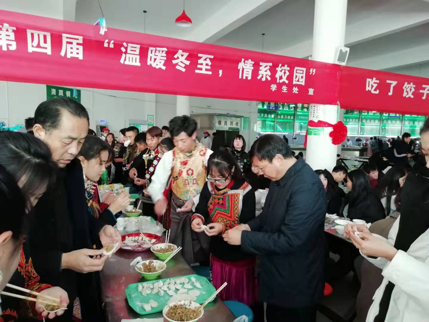 上午11时,在开元校区学生餐厅一楼,热情洋溢的师生们共同擀面皮,包饺子,煮饺子,其乐融融,李清臣,李森和来自14个民族的学生代表边吃饺子边话家常,向学生们讲解冬至的来历,问询大家的学习、生活情况,鼓励同学们好好学习,练好本领,学校永远是大家的港湾、温暖的“家”。兴奋的少数民族学生激动的用自己的家乡话唱起了“祝酒歌“。