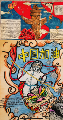 一等奖获得者学前与艺术学院游争文作品《中国加油》生动形象的描绘出白衣天使与病毒搏斗的画面,表达出对英雄崇高的敬意,书写青春无悔的战歌;学前与艺术学院杜雯作品《祖国》配以中国吉祥物,寓意祖国美好的明天。