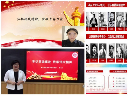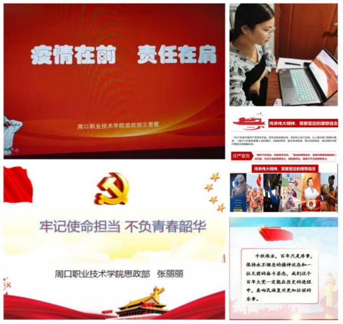 “思政开学第一课”以“把灾难当教材,与祖国共成长”为主题,以抗洪救灾、抗击疫情为题材,以建党100周年党史学习教育为契机,精心谋划,别开生面,融思政教育于线上教学中。邹红双老师以《以梦为马 不负韶华》为题、栗苏老师以《牢记英雄事迹 传承伟大精神》为题、张丽丽老师以《牢记使命担当 不负青春韶华》为题、杜艳艳老师以《初心依旧、使命在肩,抗疫防洪、举国同行》为题、袁会敏老师以《弘扬抗疫精神,贡献青春力量》为题、王雪霞老师以《疫情在前,责任在肩》、王盈盈老师以《党旗风中扬 磨难变辉煌》为题讲授“思政开学第一课”。