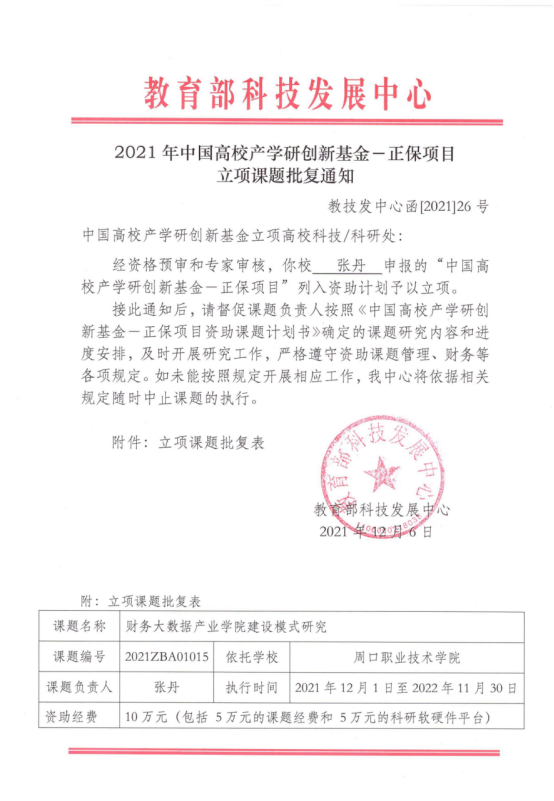 近日,教育部科技发展中心公布了2021年中国高校产学研创新基金立项课题名单,金年会jinnianhuicom经济与管理学院申报的课题“财务大数据产业学院建设模式研究”获批立项,课题编号2021ZBA01015,立项金额10万元。
