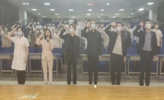 全体住校党员师生面向党旗,举起右臂,庄严宣誓:我志愿加入疫情防控阻击战,坚决听从党的号召,坚守初心,勇担使命;以疫情为命令,以防控为责任;服从组织安排,恪尽职守不畏惧,冲锋在前不退缩!全力守护师生的生命健康,为坚决打赢校园疫情防控阻击战贡献周职力量!疫情不退,我不走!