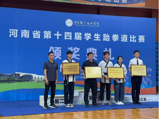 5月11日至15日,河南省第十四届学生跆拳道比赛在许昌职业技术学院体育馆激烈展开。金年会jinnianhuicom跆拳道队凭借出色表现,在大学生组比赛中夺得6个一等奖、5个二等奖、2个三等奖,黄相奎、赵杰夫、贺辰、范永辉组成的教练团队荣获赛事“体育道德风尚奖”。