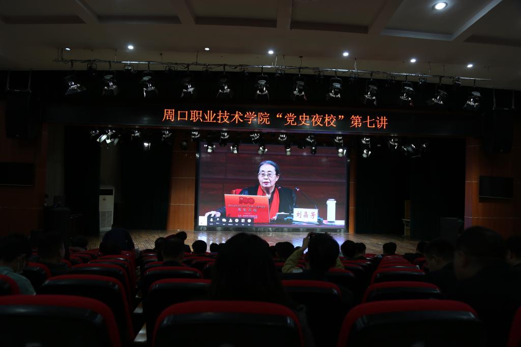 4月14日晚,金年会在开元校区砺德厅组织收听收看周口市庆祝中国共产党成立100周年“党史夜校”第七期专题讲座。全体校领导,学校副科级以上干部参加专题讲座。