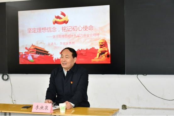 为深入学习贯彻党的十九届六中全会精神,11月23日中午一点,在六区一楼6143教室,校党委副书记、工会主席李庶泉教授以“坚定理想信念、铭记初心使命”为题,为信息工程学院师生上了一节生动的党课。信工学院班子成员、教师党员及参加第二十二期入党积极分子培训的60余名学生参加了本次党课学习,党课由信工学院党总支书记李强主持。