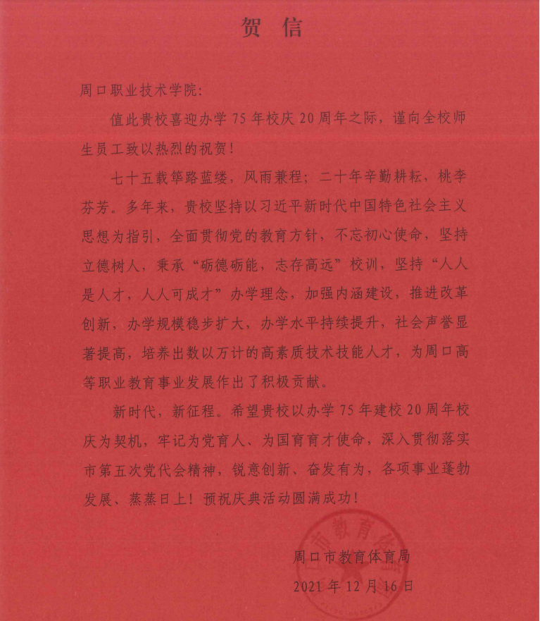 【献礼校庆】周口市教育体育局贺信