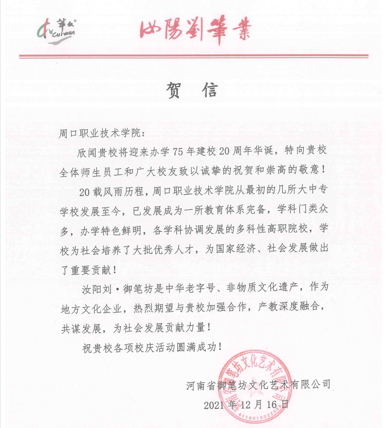 【献礼校庆】河南省御笔坊文化艺术有限公司贺信、贺礼