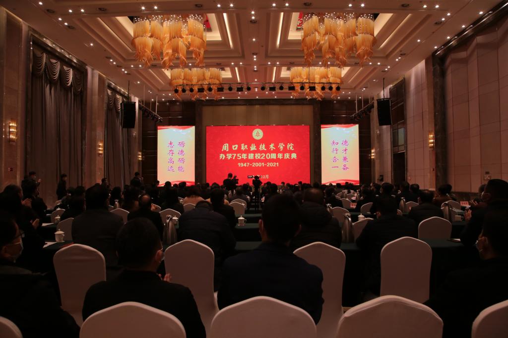 七十五年弦歌不辍,薪火相传;二十载砥砺奋进,春华秋实。2021年12月18日上午,金年会隆重举行办学75年建校20周年庆祝活动。周口市委常委、宣传部部长王少青,周口市人大常委会副主任建志,周口市人民政府副市长秦胜军,周口市政协副主席杨珺,河南科技职业大学党委书记王剑,河南省政府参事、驻马店市原副市长张德轩,周口市人大常委会原副主任解冰山,金年会jinnianhuicom原党委书记李松海,金年会jinnianhuicom原校长张卫宪出席活动。出席活动的还有全体校领导,周口市直部分单位的领导,学校部分历任领导,市内兄弟院校的领导,部分知名校友。校长李清臣主持会议。