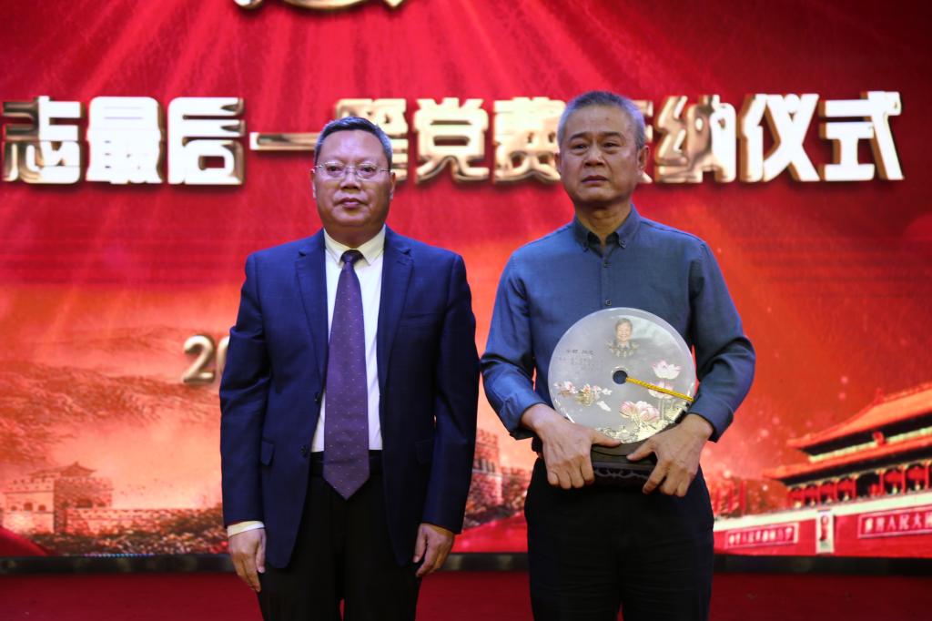 李学杰代表故去的母亲向党组织交纳最后一笔党费,李明臣代表党组织接收党费。