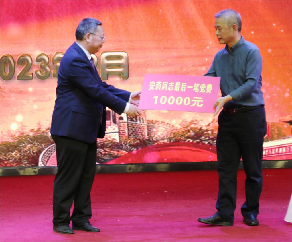 捐赠仪式上,李明臣怀着特别崇敬和敬仰的心情介绍安莉同志的生平事迹。安莉同志,1932年8月出生于江西万安县,学生时期参加四维儿童训练班,1945年参军,转战南北,1949年在北京参加工作。为支持地方戏曲事业发展,先是主动申请从中国戏曲学校到河南省戏曲学校任教,后又调到周口越调剧团、周口豫剧团、周口艺术学校工作,她对党的事业无限忠诚,为戏曲专业培养了大批地方优秀人才,是周口戏曲艺术教育的奠基人,深受领导敬重、师生爱戴。1992年1月,光荣离休。2023年7月,因病逝世。安莉同志毕生从事戏曲教育事业,几十年来,兢兢业业、忠于职守、任劳任怨、甘于奉献,用一生忠实践行一个共产党员的铮铮誓言。旧社会的苦难、革命斗争战火硝烟和血的考验,铸就对党的赤胆忠心。离休后,她时刻铭记自己是一名共产党员,不忘初心,牢记使命,艰苦朴素,省吃俭用,每当一方有难时,总是毫不犹豫、慷慨解囊,先后为希望工程、98抗洪、四川赈灾、甘肃抗震救灾、疫情防控等多次捐款,忠实展现了一名优秀共产党员的高风亮节和赤子情怀。
