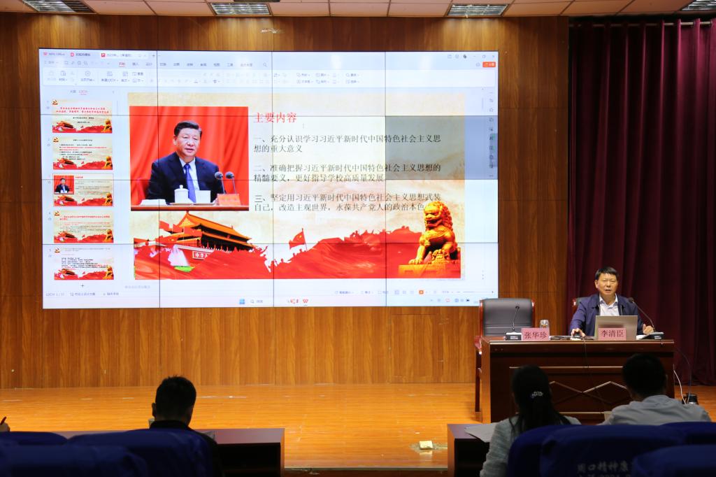 李清臣围绕“充分认识学习习近平新时代中国特色社会主义思想的重大意义”“准确把握习近平新时代中国特色社会主义思想的精髓要义,更好指导学校高质量发展”“坚定用习近平新时代中国特色社会主义思想武装自己,改造主观世界,永葆共产党人的政治本色”三个方面,结合自身工作实际和切身感受进行全面解读,重点阐释了习近平新时代中国特色社会主义思想重大深远的历史意义,全面准确把握习近平新时代中国特色社会主义思想内容。